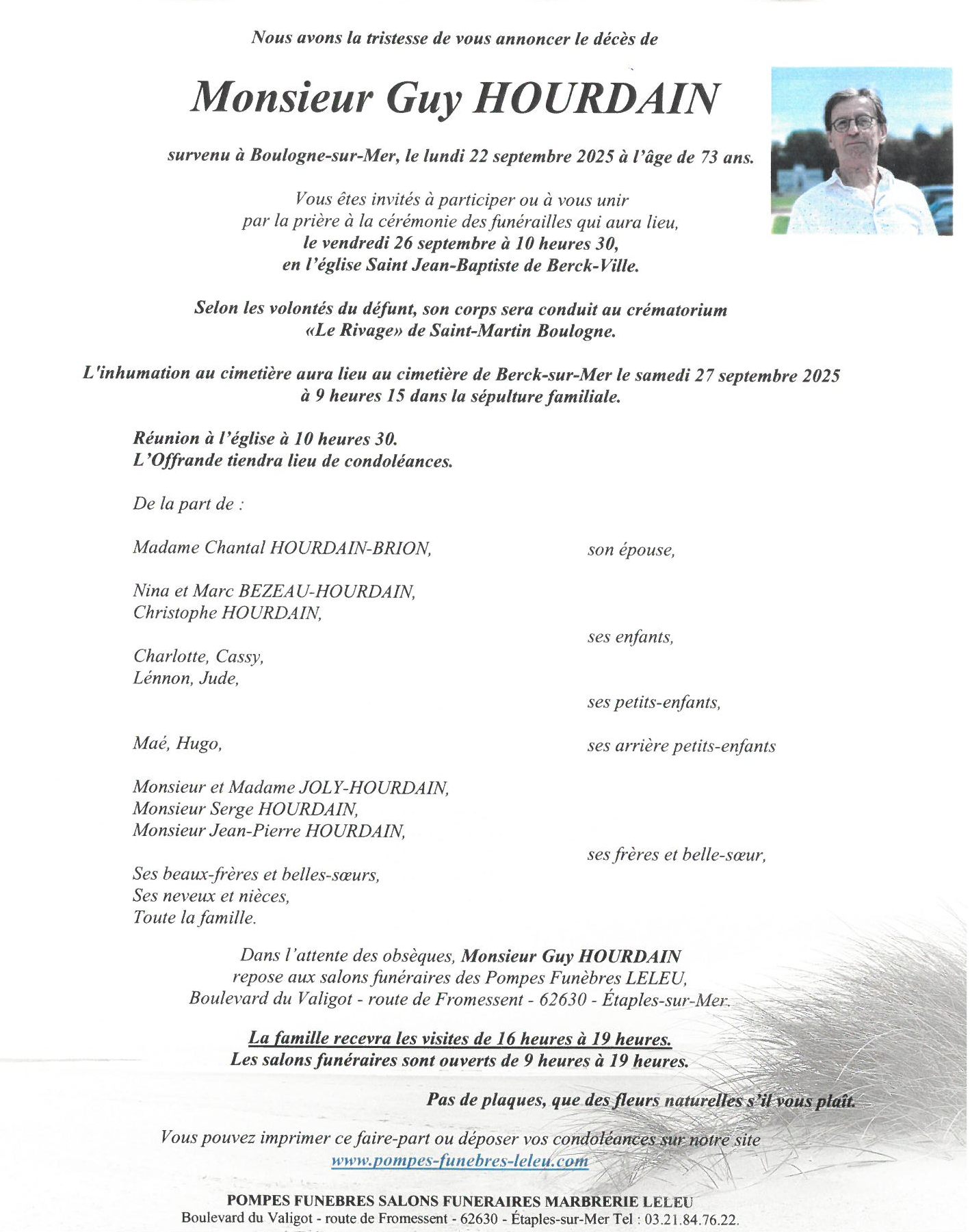 Église Sainte-Jeanne-d'Arc du Touquet-Paris-Plage, suivie de l'inhumation au cimetière Parisien de Saint-Ouen le vendredi 10 octobre 2025 à 11 heures dans l'intimité familiale.