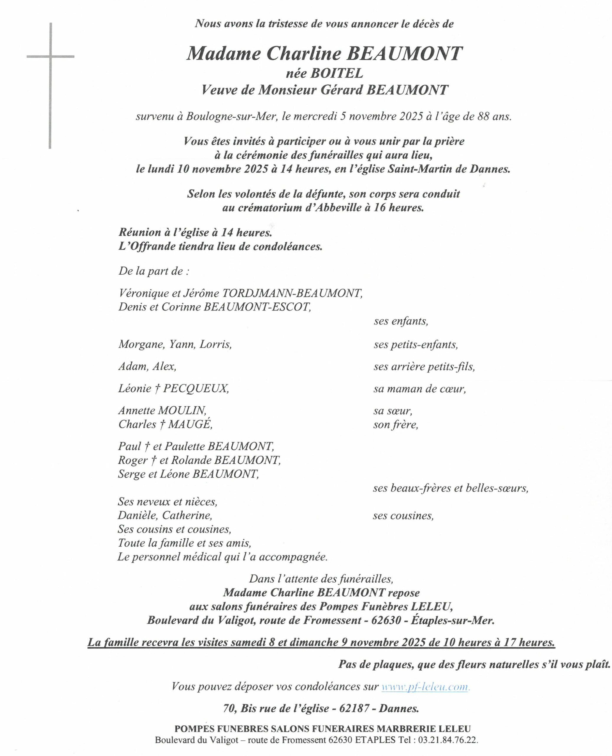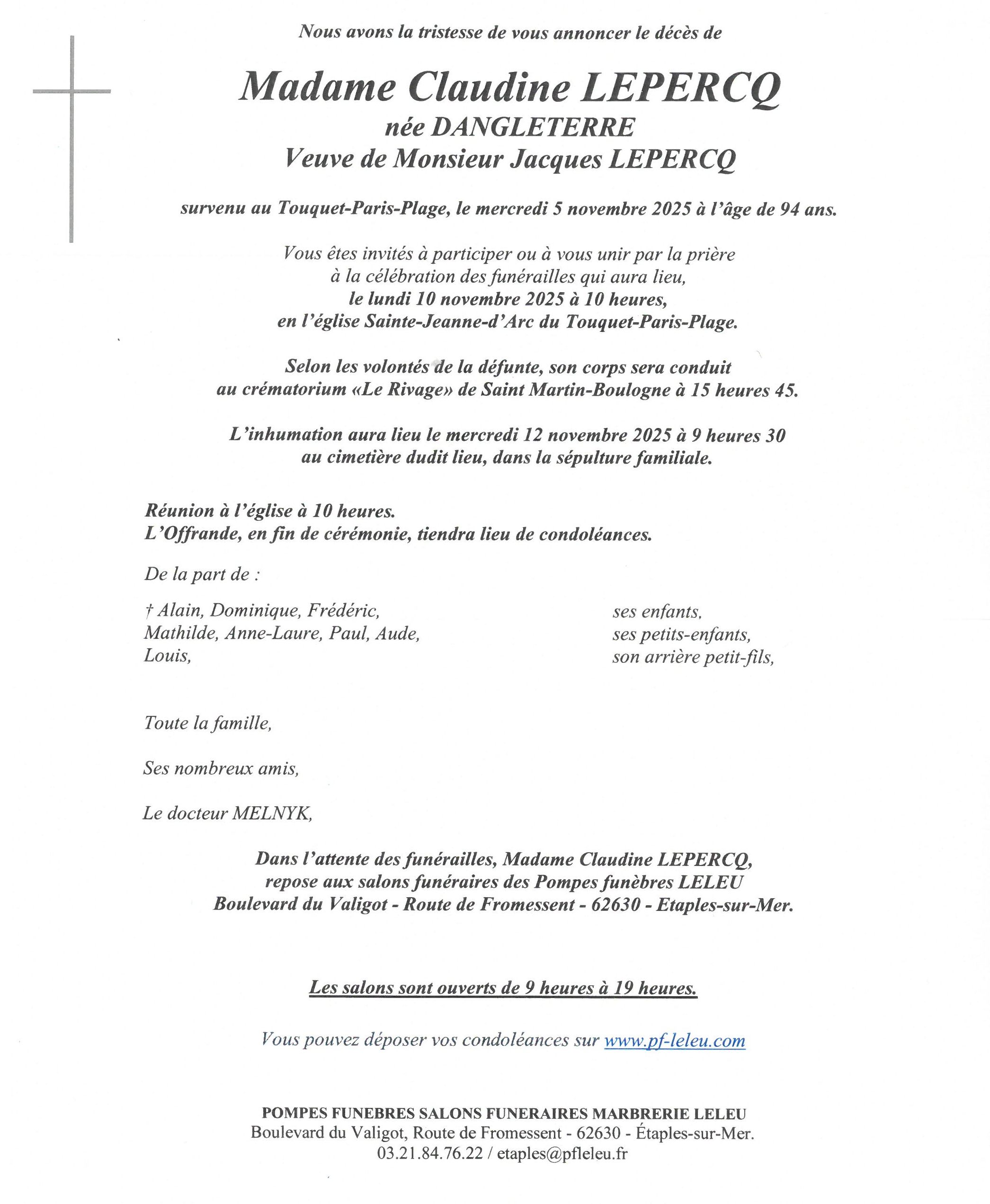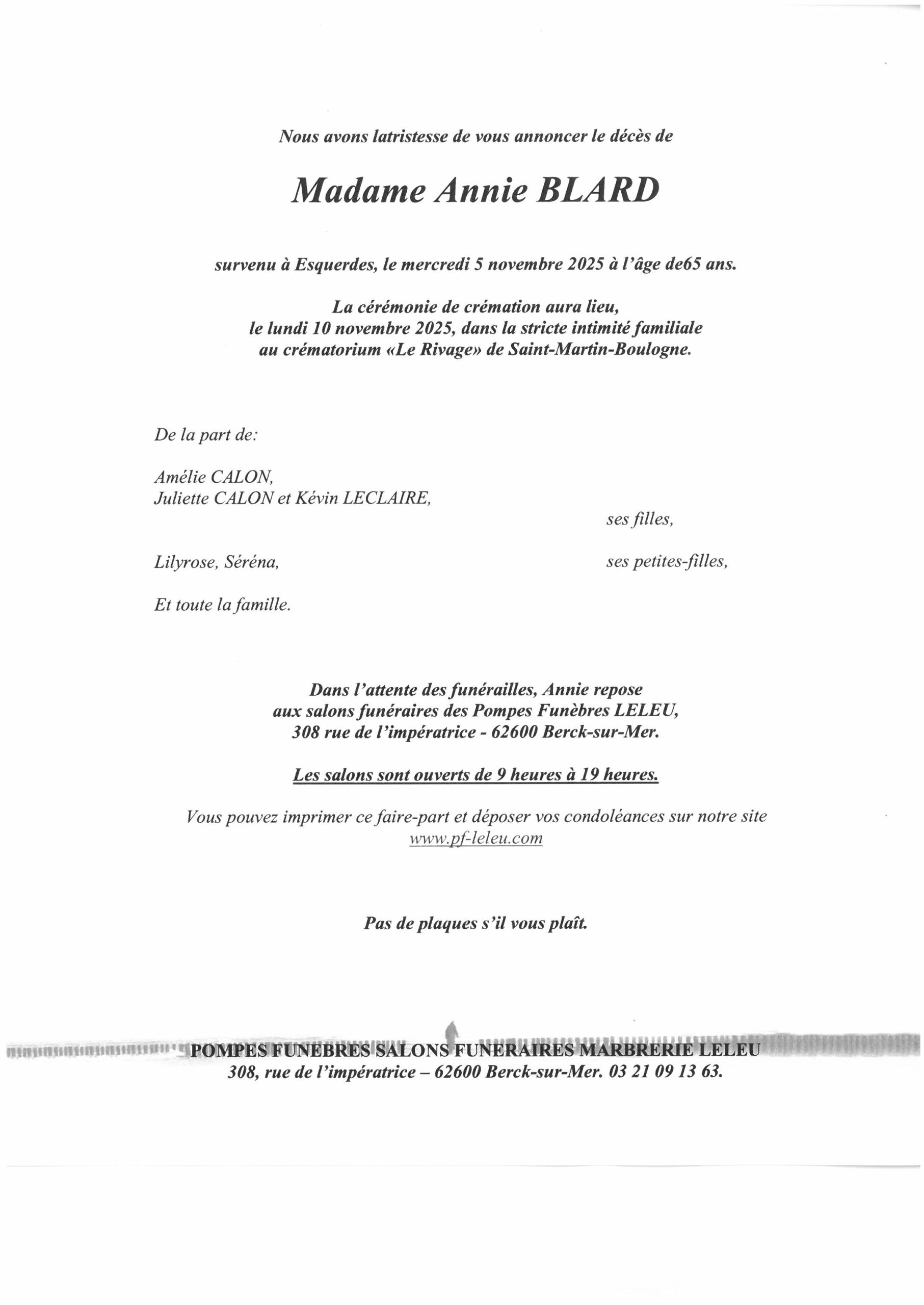 L'inhumation aura lieu le Mardi 28 octobre 2025 à 14 heures, au cimetière de Berck dans le caveau de famille. (Pas de faire-part)