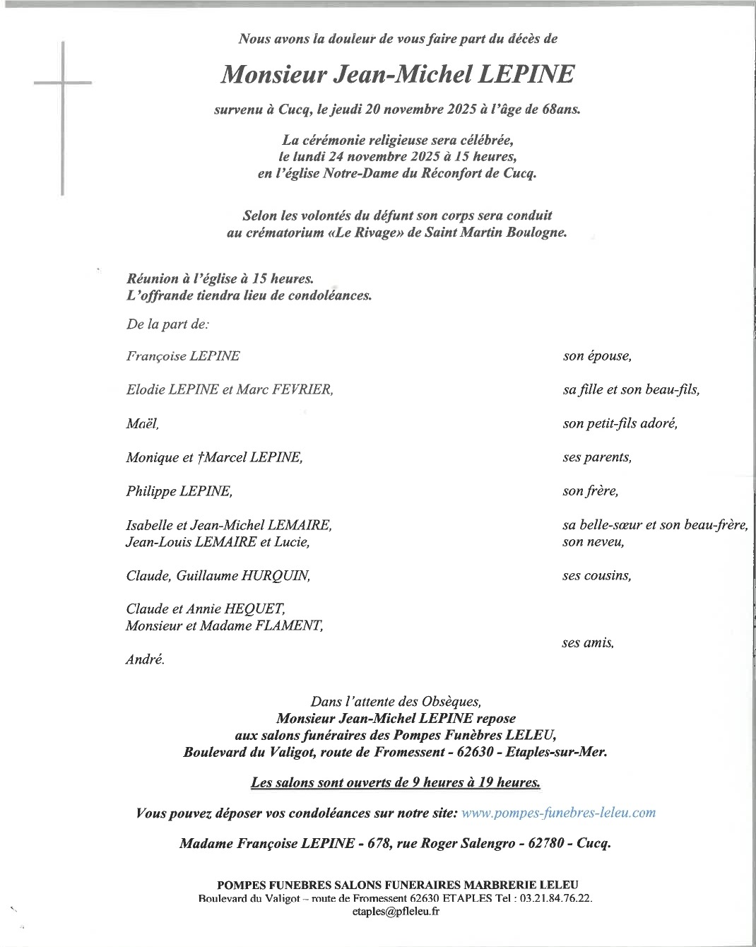 Eglise de Notre-Dame-du-Réconfort de Cucq suivi de la crémation au Rivage de Saint-Martin-Boulogne.